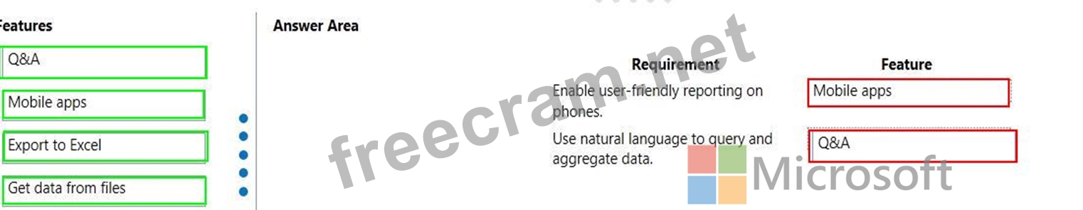 Match each Power Bl feature to its requirement. To answer, drag the appropriate features from the column on the left to its requirement on the right. Each option may be used once, more than once, or not at all.