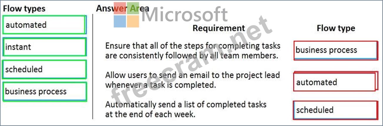 Which types of flows should you use? To answer, drag the appropriate flow types to the correct requirement. Each flow type may be used once, more than once, or not at all. You may need to drag the split bar between panes or scroll to view content.