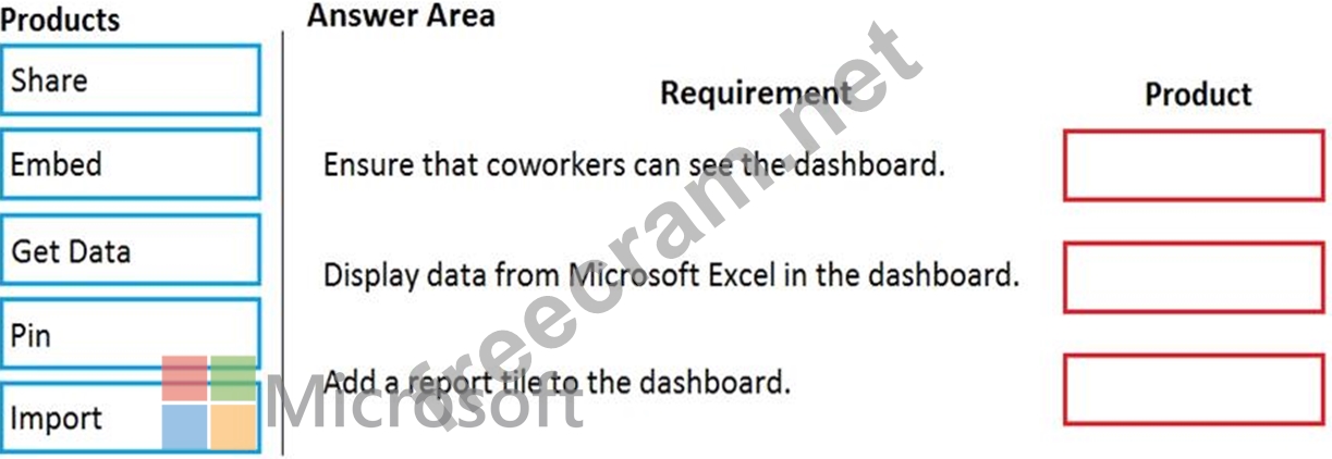 Question 46: You create a Power BI dashboard. Match each option to its fu...