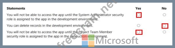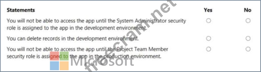 You have been granted the System Administrator security role to the development environment and a custom security role named Project Team Member to the production environment Instructions: For each of the following statements, select Yes rf the statement is true. Otherwise, select No.