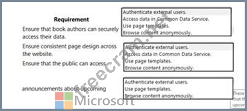 The company wants to implement a Power Apps portal solution to make announcements about upcoming books to the general public.