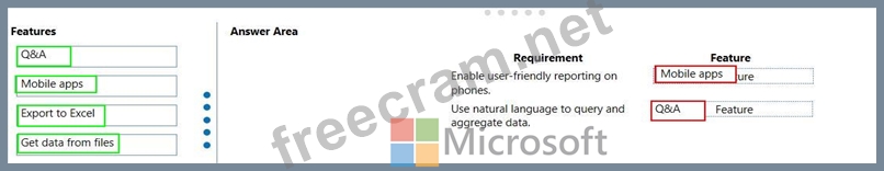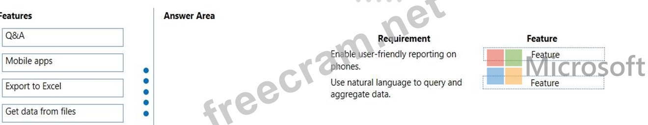 Match each Power Bl feature to its requirement. To answer, drag the appropriate features from the column on the left to its requirement on the right. Each option may be used once, more than once, or not at all.