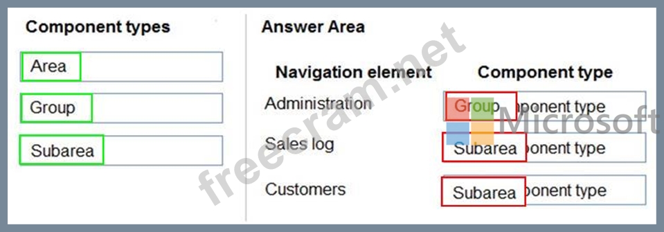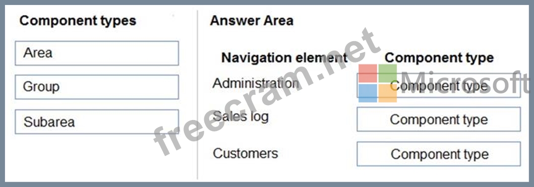 Which sitemap component types should you use? To answer, drag the appropriate component types to the correct navigation elements. Each component type may be used once, more than once, or not at all. You may need to drag the split bar between panes or scroll to view content.
