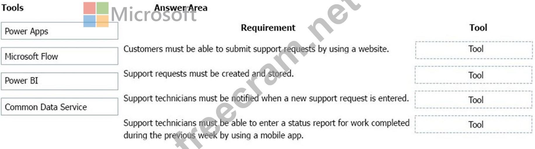 Which tools should you recommend? To answer, drag the appropriate tools to the correct requirements. Each tool may be used once, more than once, or not at all. You may need to drag the split bar between panes or scroll to view content.