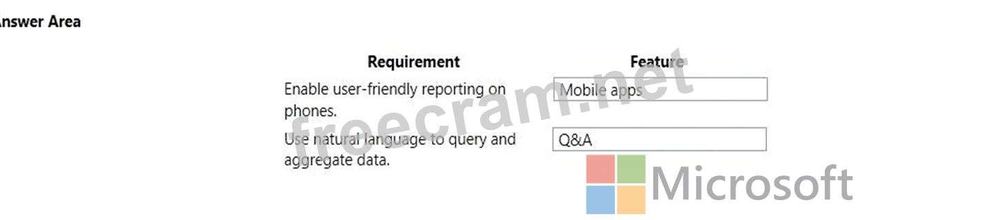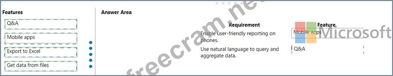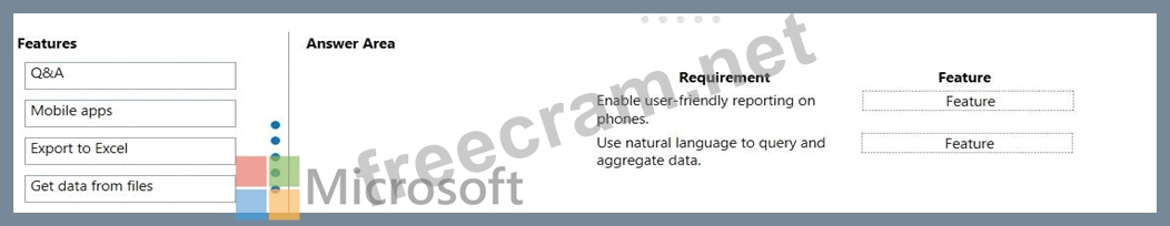 Match each Power Bl feature to its requirement. To answer, drag the appropriate features from the column on the left to its requirement on the right. Each option may be used once, more than once, or not at all.