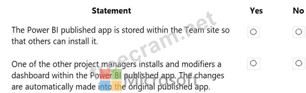 You create reports within Power BI to report on the status of a project. A manager asks you to share the reports with other team members. You decide to create a published app and set permissions to allow other team members to view the reports.