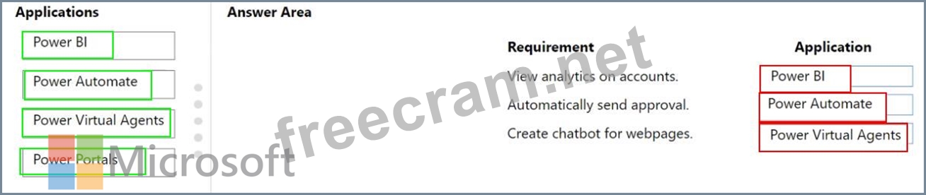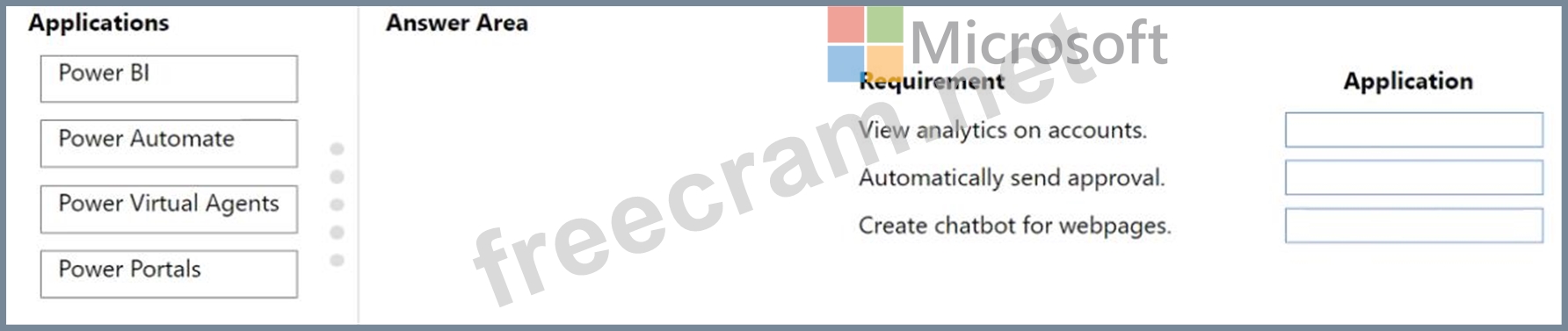 You must use Microsoft Power Platform to extend the capabilities of Dynamics 365 Sales. You need to select an application for each requirement.