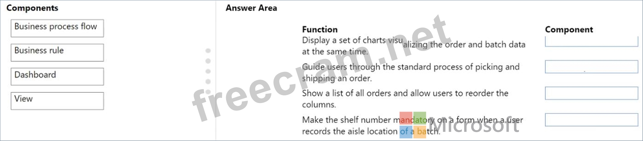 A manufacturing company is building a model-driven app to manage its warehouse. The app has two custom tables: Order and Batch.