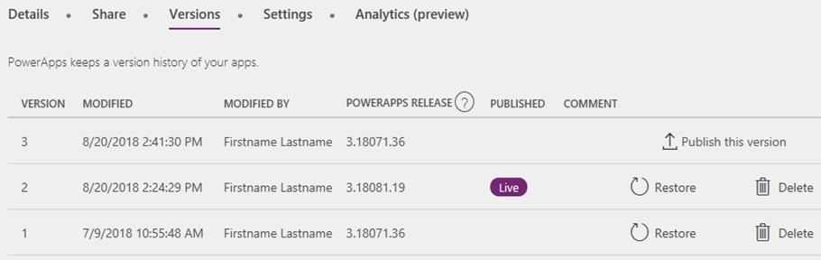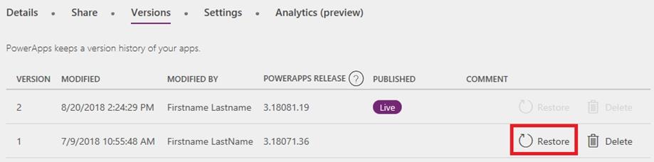 You have a Power Apps app. You create a new version of the app and then publish the new version. A customer goes through the process of restoring the previous version of the app. In the Version tab for the app, you will see two versions of the app.