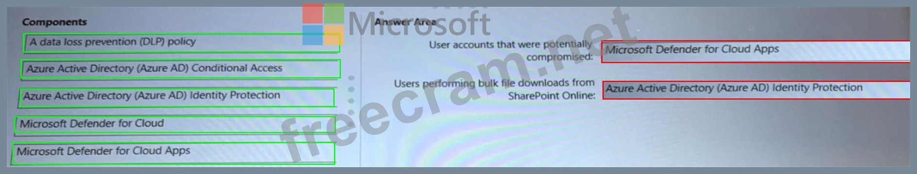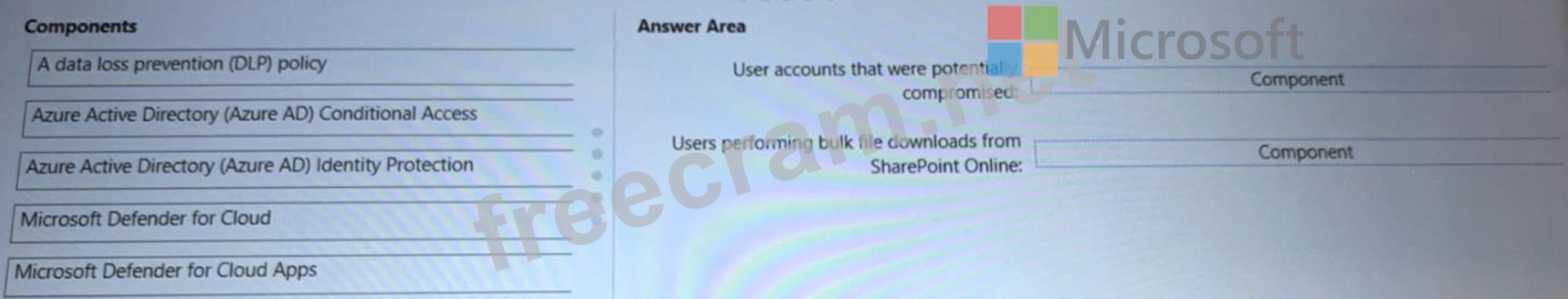 * Users performing bulk file downloads from Microsoft SharePoint Online What should you include in the recommendation for each activity? To answer, drag the appropriate components to the correct activities. Each component may be used once, more than once, or not at all. You may need to drag the split bar between panes or scroll to view content.