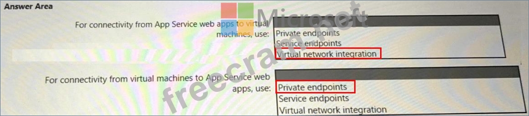 You need to recommend a strategy for App Service web app connectivity. The solution must meet the landing zone requirements. What should you recommend? To answer, select the appropriate options in the answer are