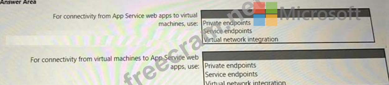 You need to recommend a strategy for App Service web app connectivity. The solution must meet the landing zone requirements. What should you recommend? To answer, select the appropriate options in the answer area. NOTE Each correct selection is worth one point.