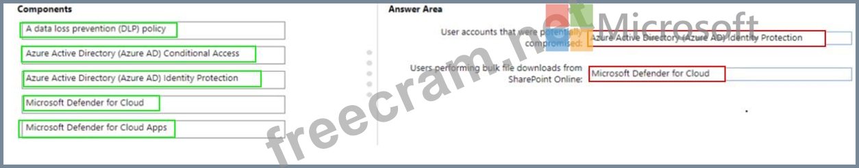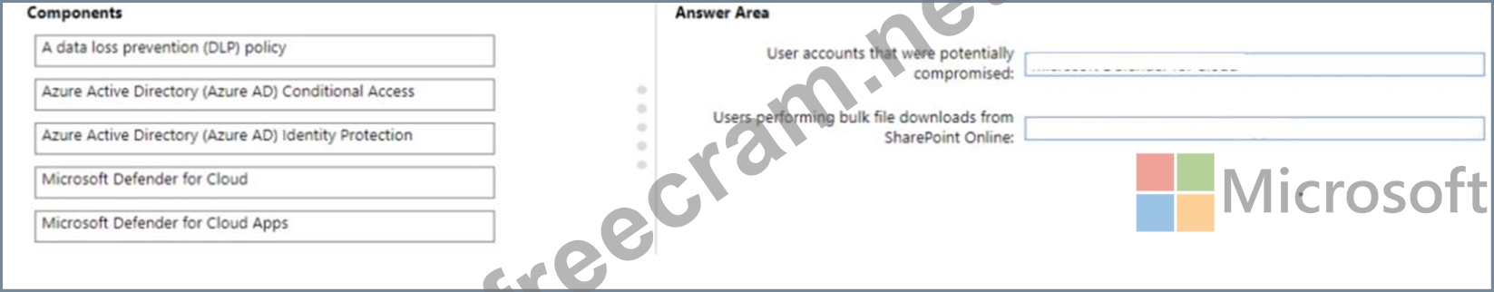 * Users performing bulk file downloads from Microsoft SharePoint Online What should you include in the recommendation for each activity? To answer, drag the appropriate components to the correct activities. Each component may be used once, more than once, or not at all. You may need to drag the split bar between panes or scroll to view content.