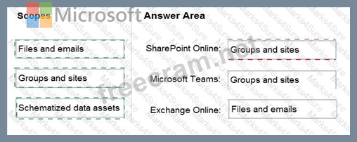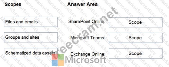 Which scope should you recommend for the sensitivity label policies? To answer, drag the appropriate scopes to the correct locations. Each scope may be used once, more than once, or not at all. You may need to drag the split bar between panes or scroll to view content.