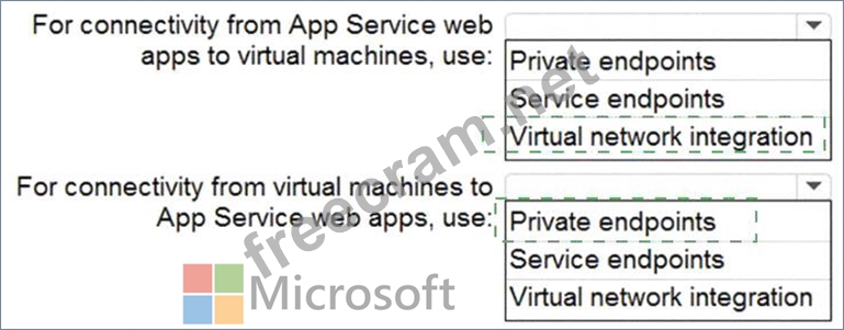You need to recommend a strategy for App Service web app connectivity. The solution must meet the landing zone requirements. What should you recommend? To answer, select the appropriate options in the answer area. NOTE Each correct selection is worth one point.