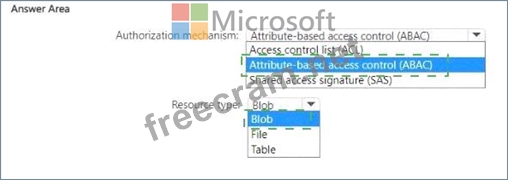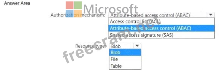 Which authorization mechanism should you enable, and which type of resource should you use to store the data? To answer, select the appropriate options in the answer area.