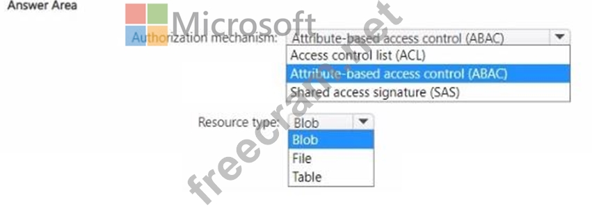 Which authorization mechanism should you enable, and which type of resource should you use to store the data? To answer, select the appropriate options in the answer area.