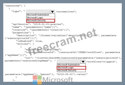 You need to use an Azure Resource Manager template to create a workflow automation that will trigger an automatic remediation when specific security alerts are received by Azure Security Center. How should you complete the portion of the template that will provision the required Azure resources? To answer, select the appropriate options in the answer area. NOTE: Each correct selection is worth one point.