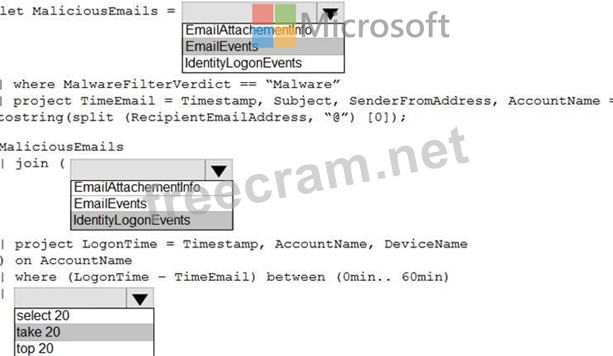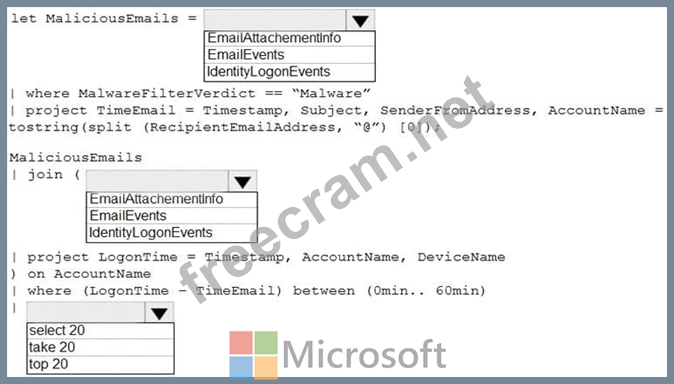 You are informed of an increase in malicious email being received by users. You need to create an advanced hunting query in Microsoft 365 Defender to identify whether the accounts of the email recipients were compromised. The query must return the most recent 20 sign-ins performed by the recipients within an hour of receiving the known malicious email. How should you complete the query? To answer, select the appropriate options in the answer area. NOTE: Each correct selection is worth one point.