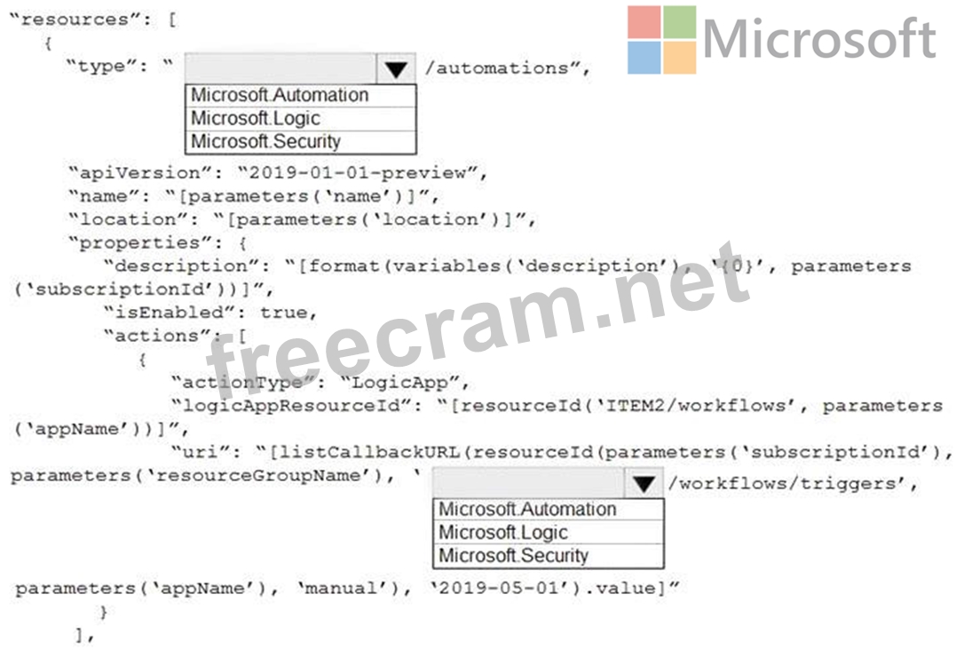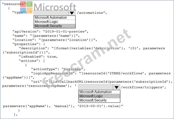 You need to use an Azure Resource Manager template to create a workflow automation that will trigger an automatic remediation when specific security alerts are received by Azure Security Center. How should you complete the portion of the template that will provision the required Azure resources? To answer, select the appropriate options in the answer area. NOTE: Each correct selection is worth one point.