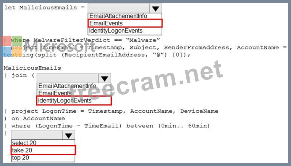 You need to create an advanced hunting query in Microsoft 365 Defender to identify whether the accounts of the email recipients were compromised. The query must return the most recent 20 sign-ins performed by the recipients within an hour of receiving the known malicious email.