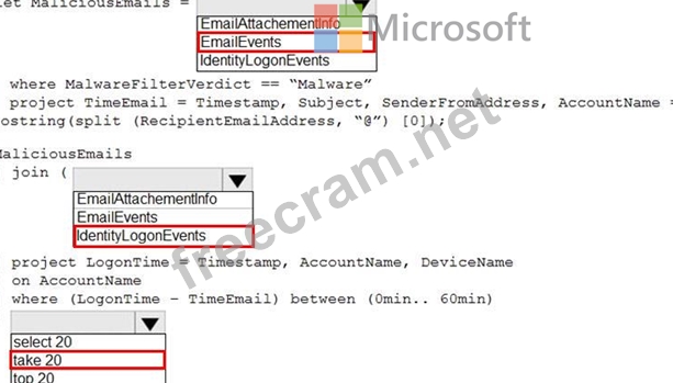 You need to create an advanced hunting query in Microsoft 365 Defender to identify whether the accounts of the email recipients were compromised. The query must return the most recent 20 sign-ins performed by the recipients within an hour of receiving the known malicious email.