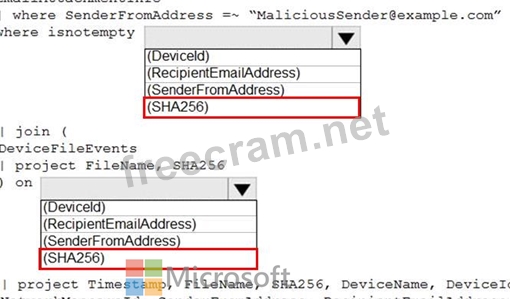 You need to identify all the devices that contain files in emails sent by a known malicious email sender. The query will be based on the match of the SHA256 hash.