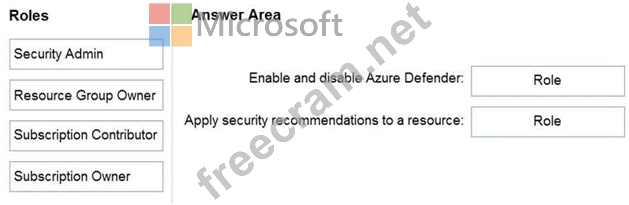 Which Azure Security Center role should you use for each requirement? To answer, drag the appropriate roles to the correct requirements. Each role may be used once, more than once, or not at all. You may need to drag the split bar between panes or scroll to view content.