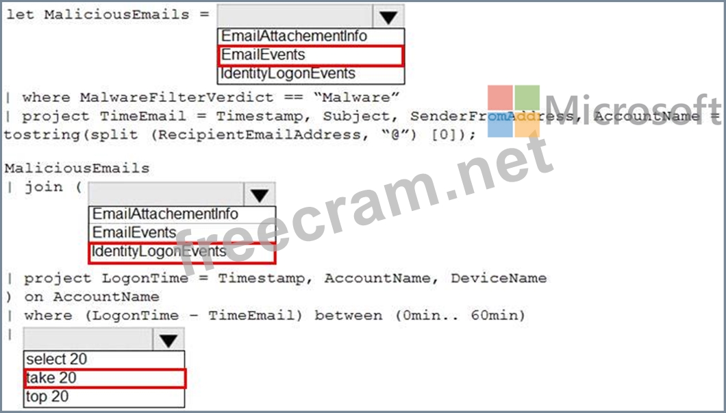 You need to create an advanced hunting query in Microsoft 365 Defender to identify whether the accounts of the email recipients were compromised. The query must return the most recent 20 sign-ins performed by the recipients within an hour of receiving the known malicious email.