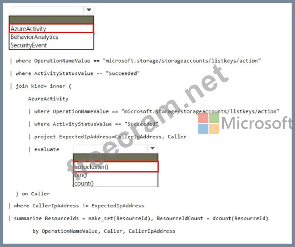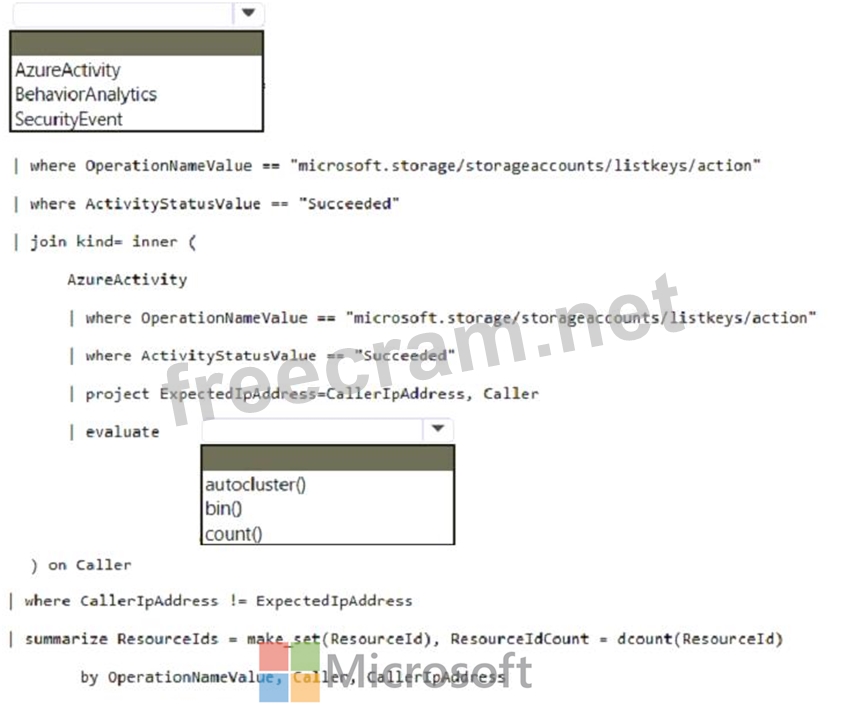You need to create a hunting query to identify users that list storage keys of multiple Azure Storage accounts. The solution must exclude users that list storage keys for a single storage account.