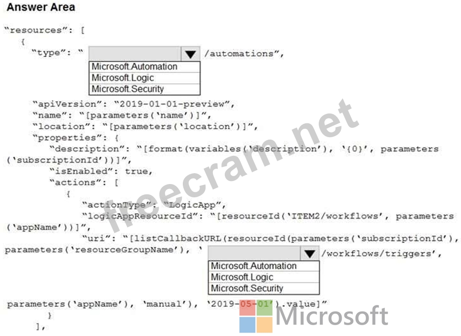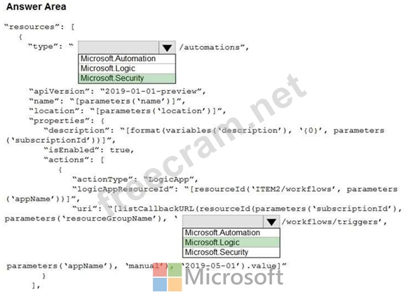 You need to use an Azure Resource Manager template to create a workflow automation that will trigger an automatic remediation when specific security alerts are received by Azure Security Center.