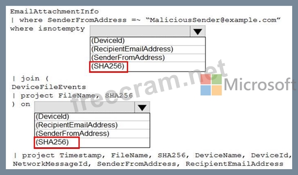 You need to identify all the devices that contain files in emails sent by a known malicious email sender. The query will be based on the match of the SHA256 hash.
