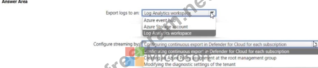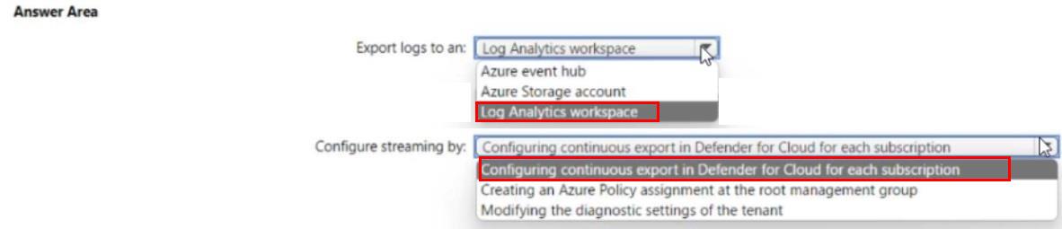 2 - Azure Policy - https://docs.microsoft.com/en-us/azure/defender-for-cloud/continuous-export?tabs=azure-policy#configure-continuous-export-at-scale-using-the-supplied-policies