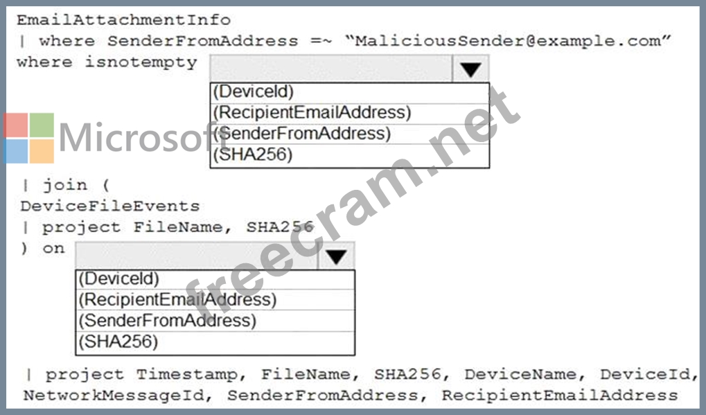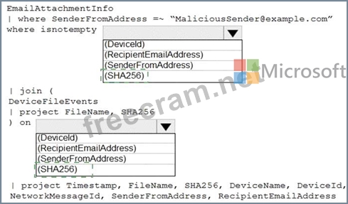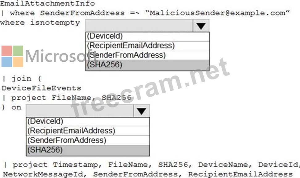 You need to identify all the devices that contain files in emails sent by a known malicious email sender. The query will be based on the match of the SHA256 hash.