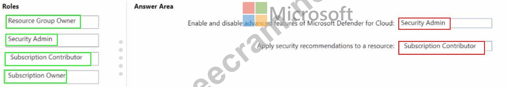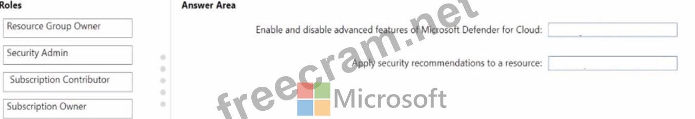 Which Microsoft Defender for Cloud role should you use for each requirement? To answer, drag the appropriate roles to the correct requirements. Each role may be used once, mote than once, or not at all. You may need to drag the split bar between panes or scroll to view content.