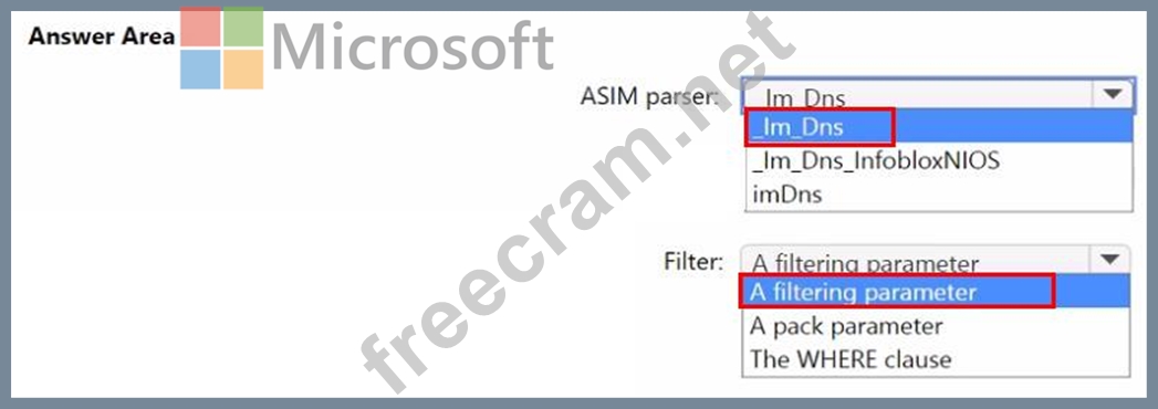 You need to implement the ASIM query for DNS requests. The solution must meet the Microsoft Sentinel requirements. How should you configure the query? To answer, select the appropriate options in the answer are a. NOTE: Each correct selection is worth one point.