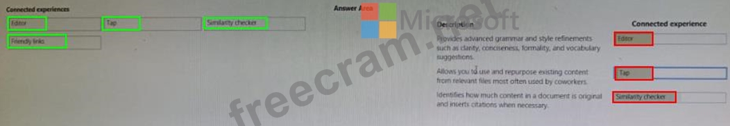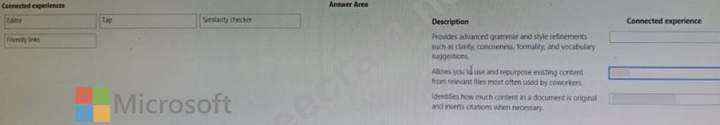 Which connected experiences should you describe? To answer, drag the appropriate connected experiences to the correct description. Each connected experience may be used once, more than once, or not at all. You may need to drag the split between panes or scroll to view content.