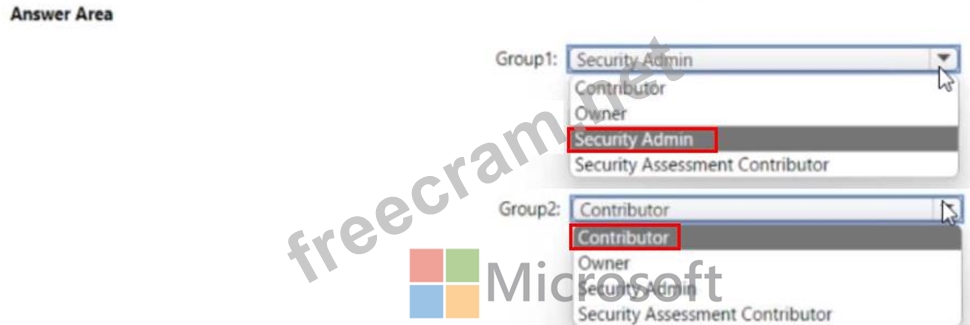 You need to assign role-based access control (RBAQ roles to Group1 and Group2 to meet The Microsoft Defender for Cloud requirements and the business requirements Which role should you assign to each group? To answer, select the appropriate options in the answer area NOTE Each correct selection is worth one point.
