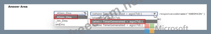 You need to create a query to investigate DNS-related activity. The solution must meet the Microsoft Sentinel requirements. How should you complete the Query? To answer, select the appropriate options in the answer area NOTE: Each correct selection is worth one point.