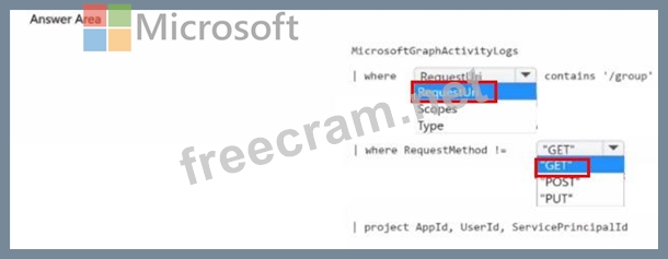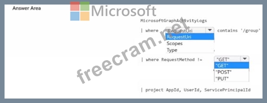 You need to identify all the security principals that submitted requests to change or delete groups. How should you complete the KQL query? To answer, select the appropriate options in the answer area.