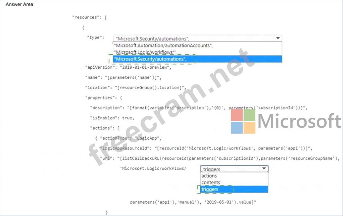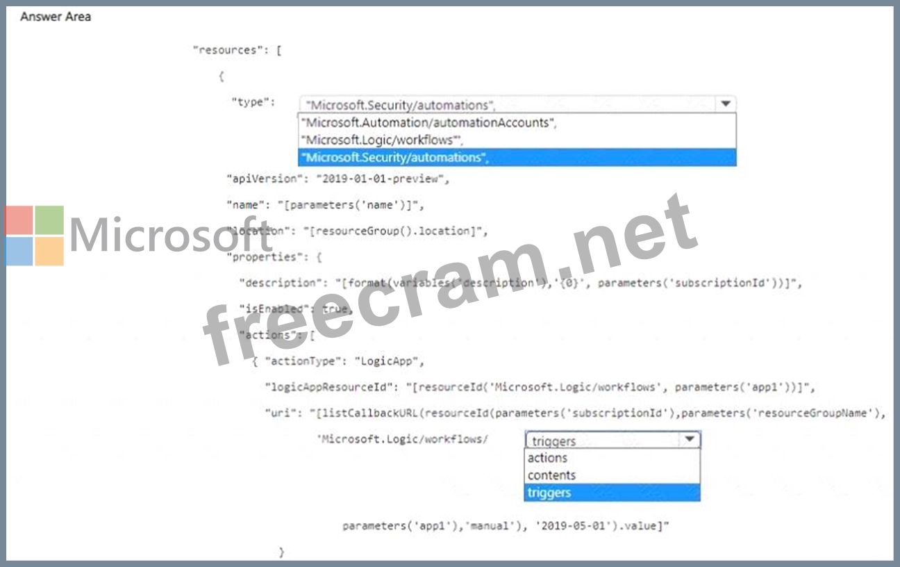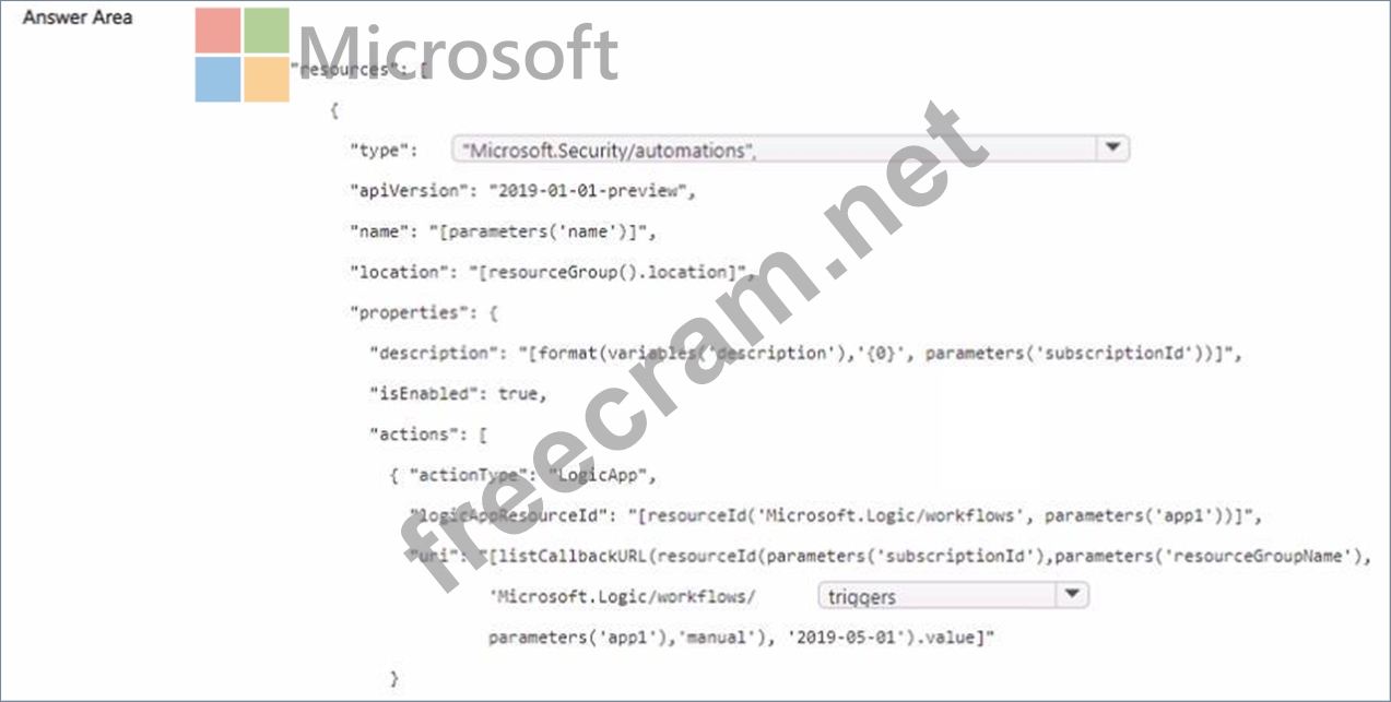 How should you complete the Azure Resource Manager (ARM) template? To answer, select the appropriate options in the answer area NOTE: Each correct selection is worth one point.