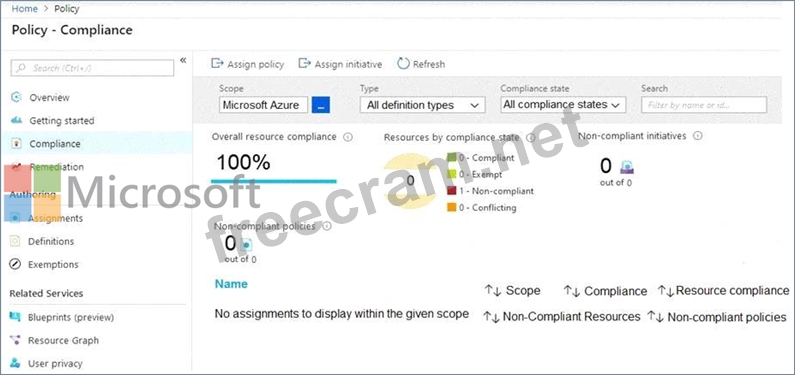 Azure Policy assignments are configured as shown in the Policies exhibit. (Click the Policies tab.)