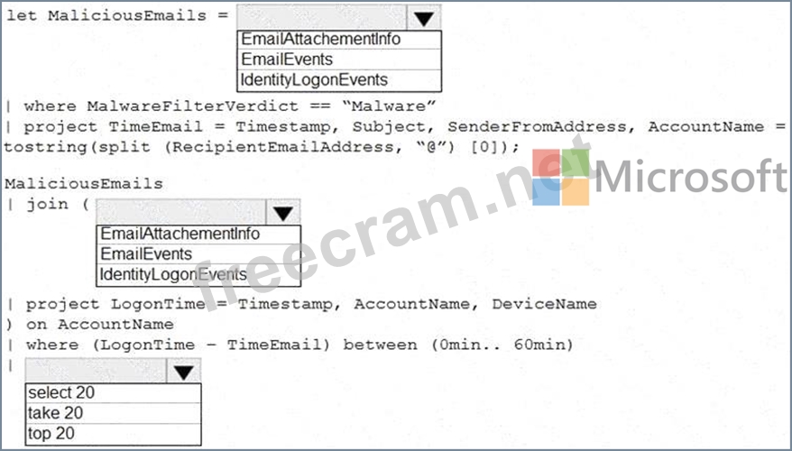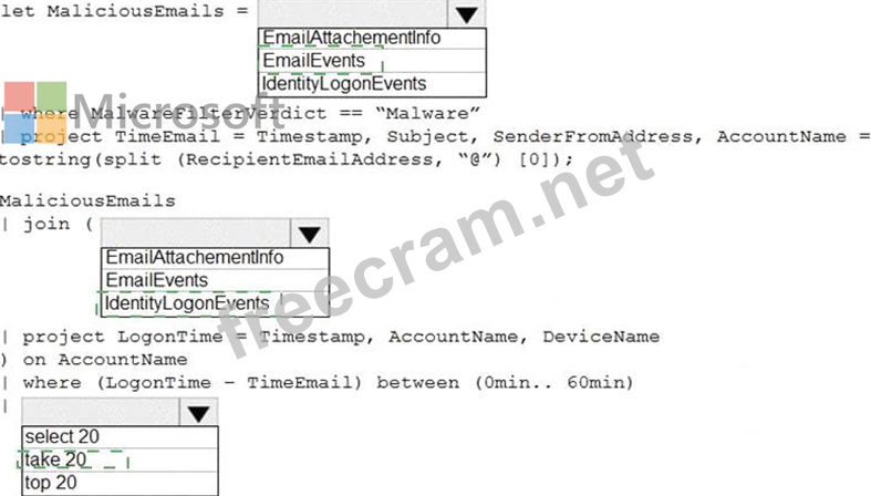 You need to create an advanced hunting query in Microsoft 365 Defender to identify whether the accounts of the email recipients were compromised. The query must return the most recent 20 sign-ins performed by the recipients within an hour of receiving the known malicious email.