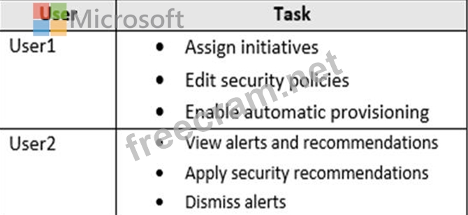 You need to enable User1 and User2 to perform tasks at the subscription level as shown in the following table.