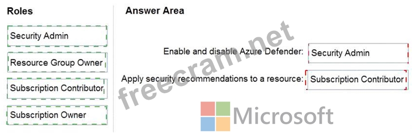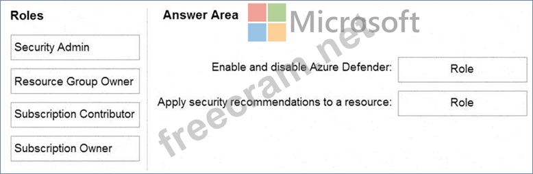 Which Azure Security Center role should you use for each requirement? To answer, drag the appropriate roles to the correct requirements. Each role may be used once, more than once, or not at all. You may need to drag the split bar between panes or scroll to view content.