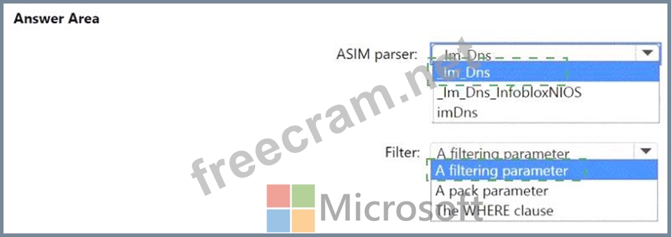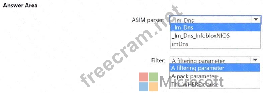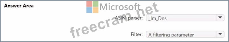 You need to implement the ASIM query for DNS requests. The solution must meet the Microsoft Sentinel requirements. How should you configure the query? To answer, select the appropriate options in the answer area. NOTE: Each correct selection is worth one point.