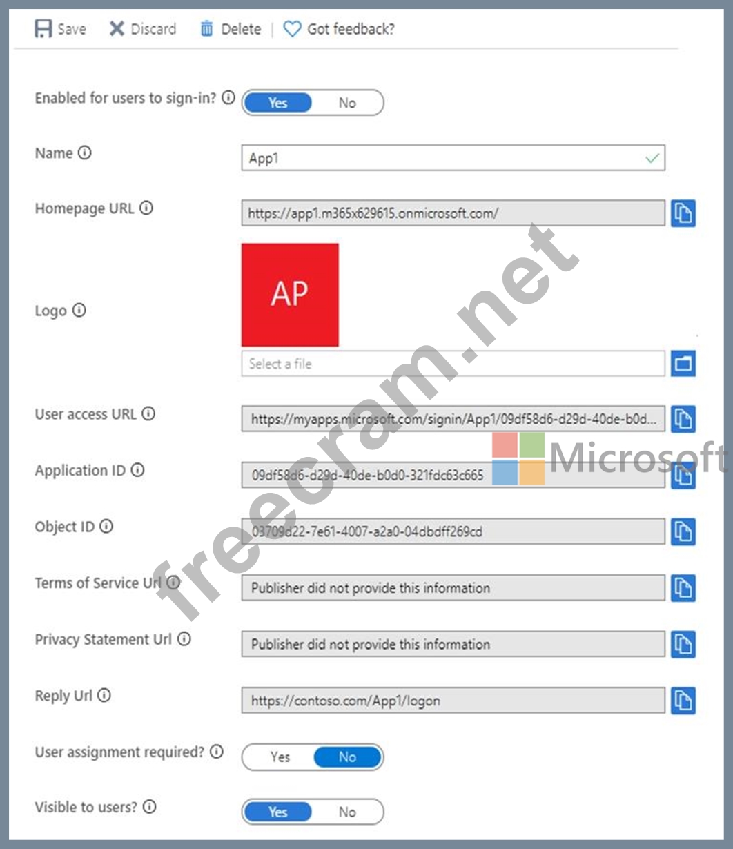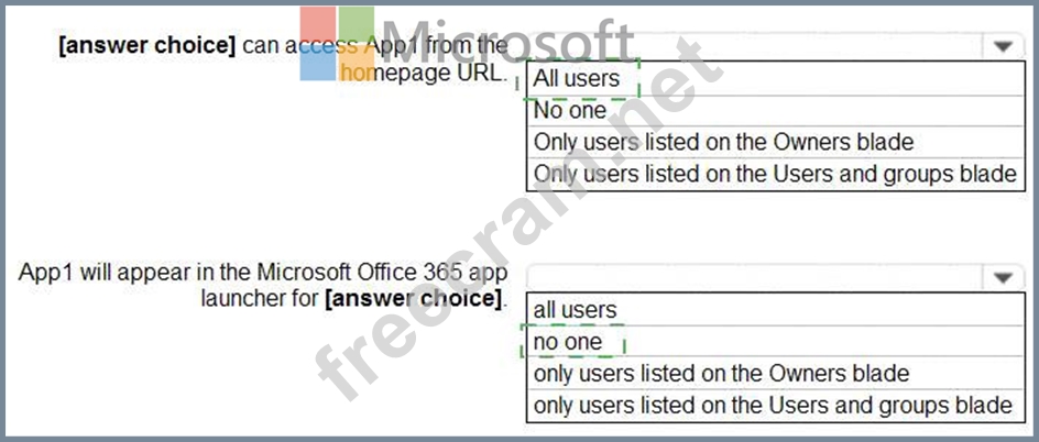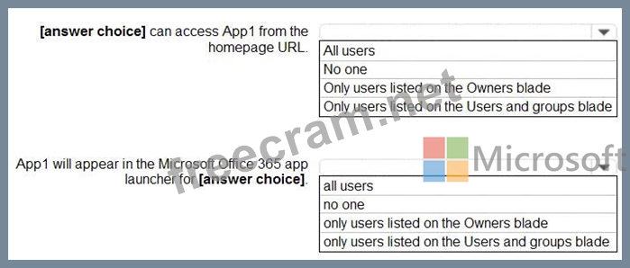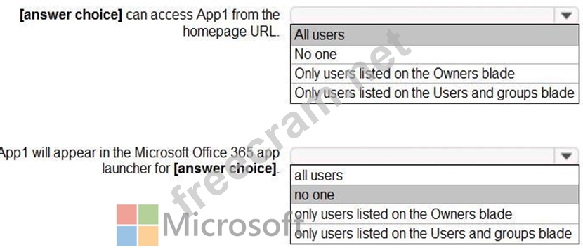 You have a custom cloud app named App1 that is registered in Azure Active Directory (Azure AD). App1 is configured as shown in the following exhibit. Use the drop-down menus to select the answer choice that completes each statement based on the information presented in the graphic. NOTE: Each correct selection is worth one point.