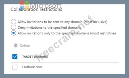 From the External collaboration settings in the Azure Active Directory admin center, you configure the Collaboration restrictions settings as shown in the following exhibit.