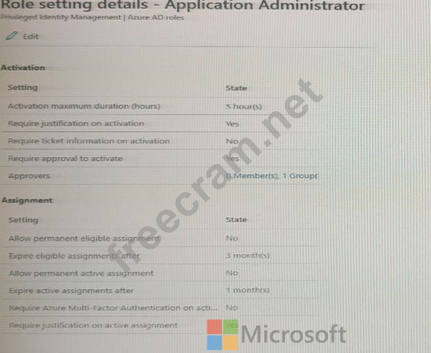 You configure a role in Azure AD Privileged identity Management (PIM) as shown in the application administrator exhibit. (Click the application Administrator tab.)