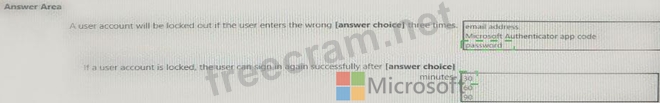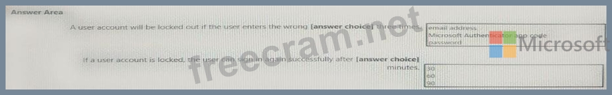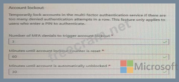 You have an Azure Active Directory (Azure AD) tenant that has multi-factor authentication (MFA) enabled. The account lockout settings are configured as shown in the following exhibit. Use the drop-down menus to select the answer choice that completes each statement based on the information presented in the graphic. NOTE: Each correct selection is worth one point.
